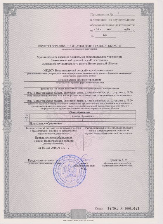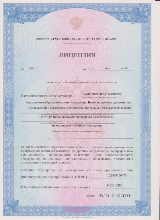 | Полное наименование образовательной организации* | Муниципальное казенное дошкольное образовательное учреждение Новоникольский детский сад «Колокольчик» Быковского муниципального района Волгоградской области |
