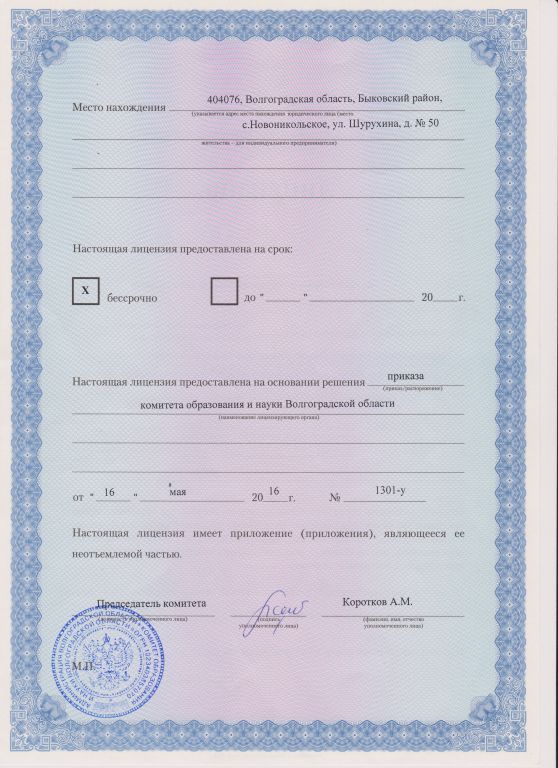 | Адрес местонахождения образовательной организации* | 404076 Волгоградская область, Быковский район, с. Новоникольское, ул. Шурухина, д. № 50 |